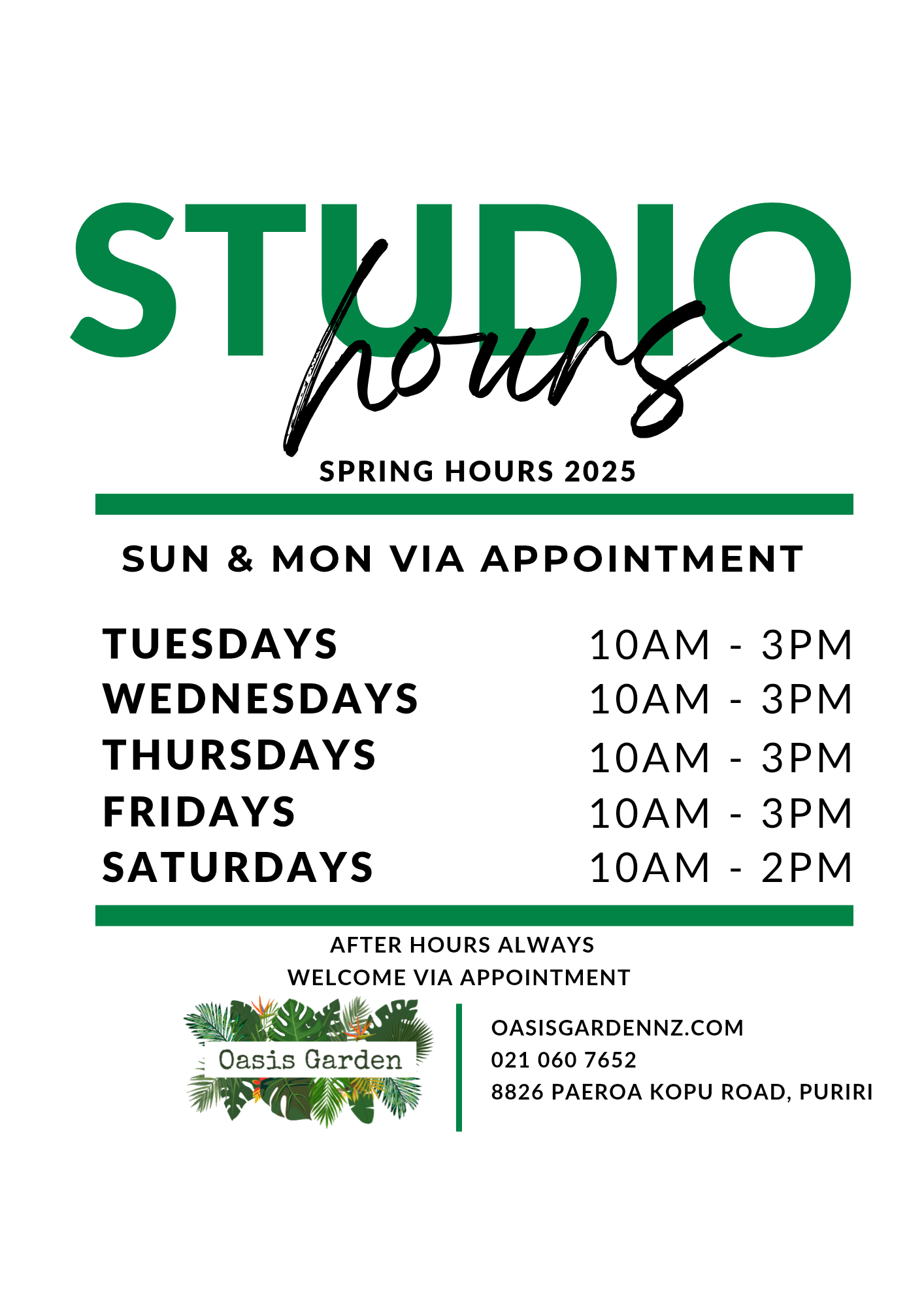 If you would like to visit the studio after hours you can do so via appointment. Please call or text me on 0210607652 to make a time❤️