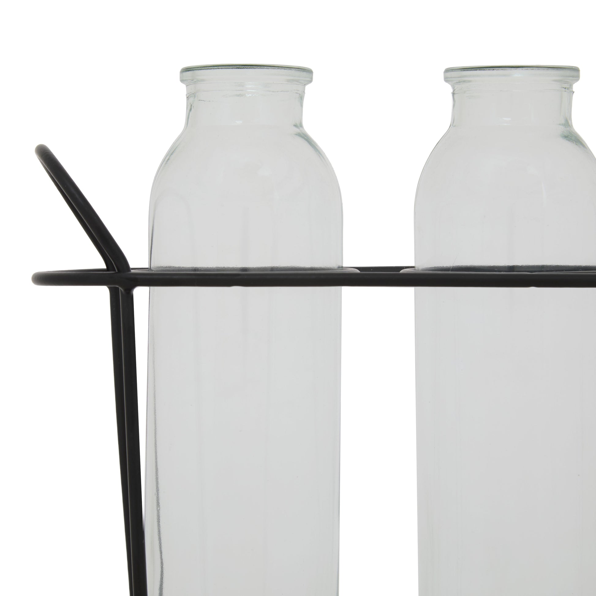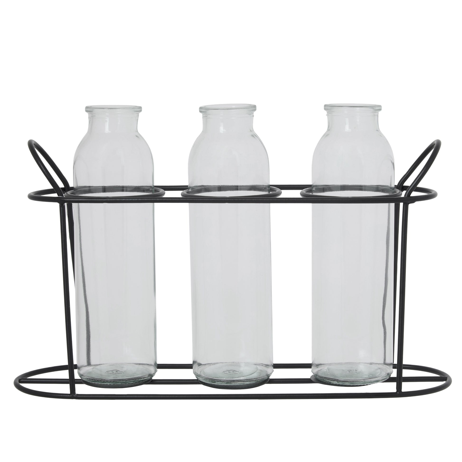 This Altea Decor Bottles in Stand features three cylindrical glass bottles in an elegant metal stand.