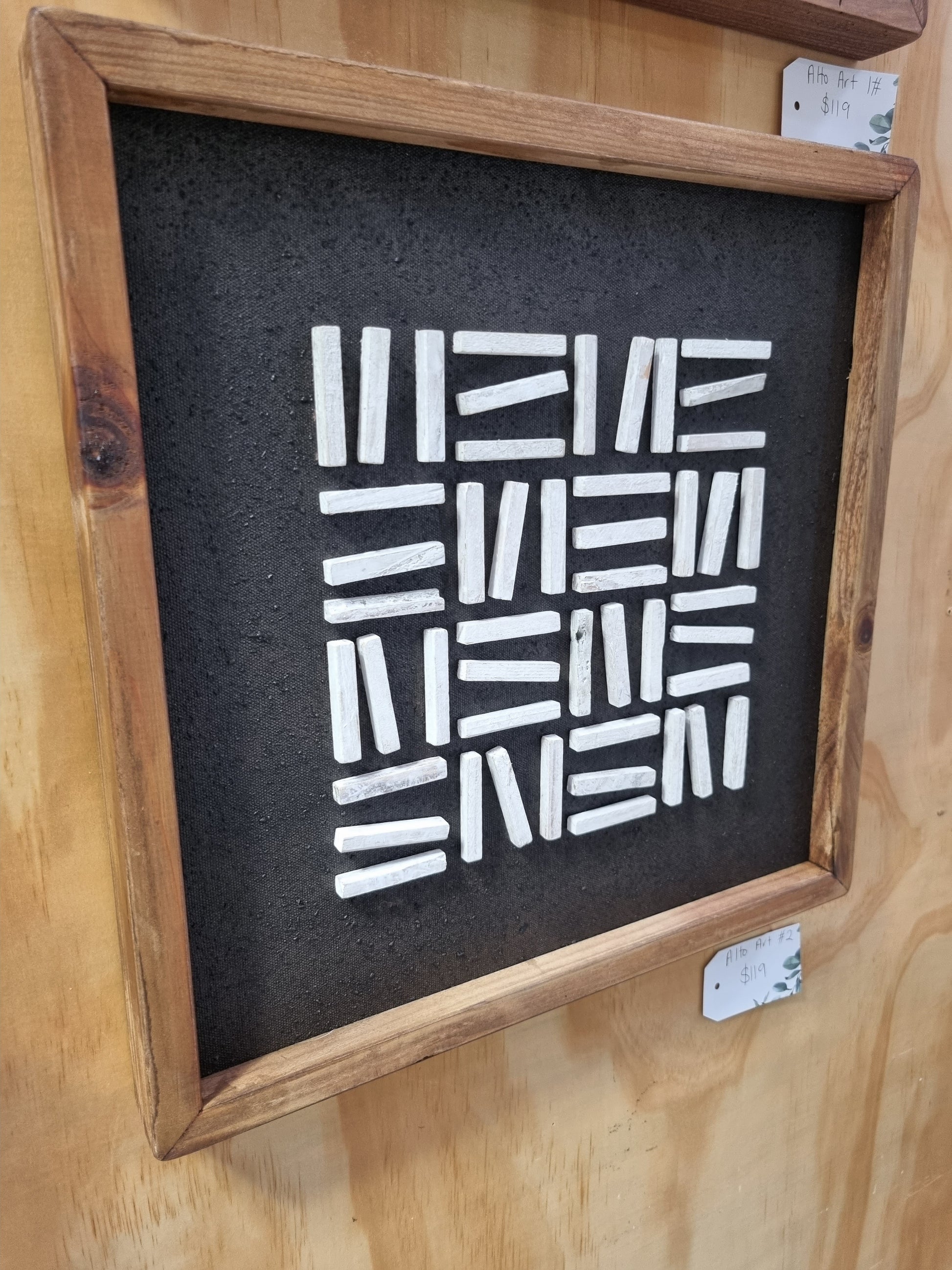 Style your walls with our contemporary new Alto wall art range. The frame has been produced from recycled elm and left as raw as possible to highlight the timber's past, including remnants of insect holes. The Alto range combines a colour palette of natural, cream, black and brown into geometric and sculptural shapes.