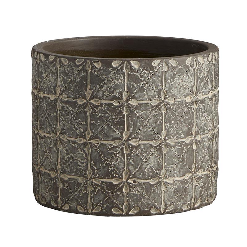 This timeless cement pot is overlaid with an etched design to bring out the natural charm that will compliment any garden or indoor space.