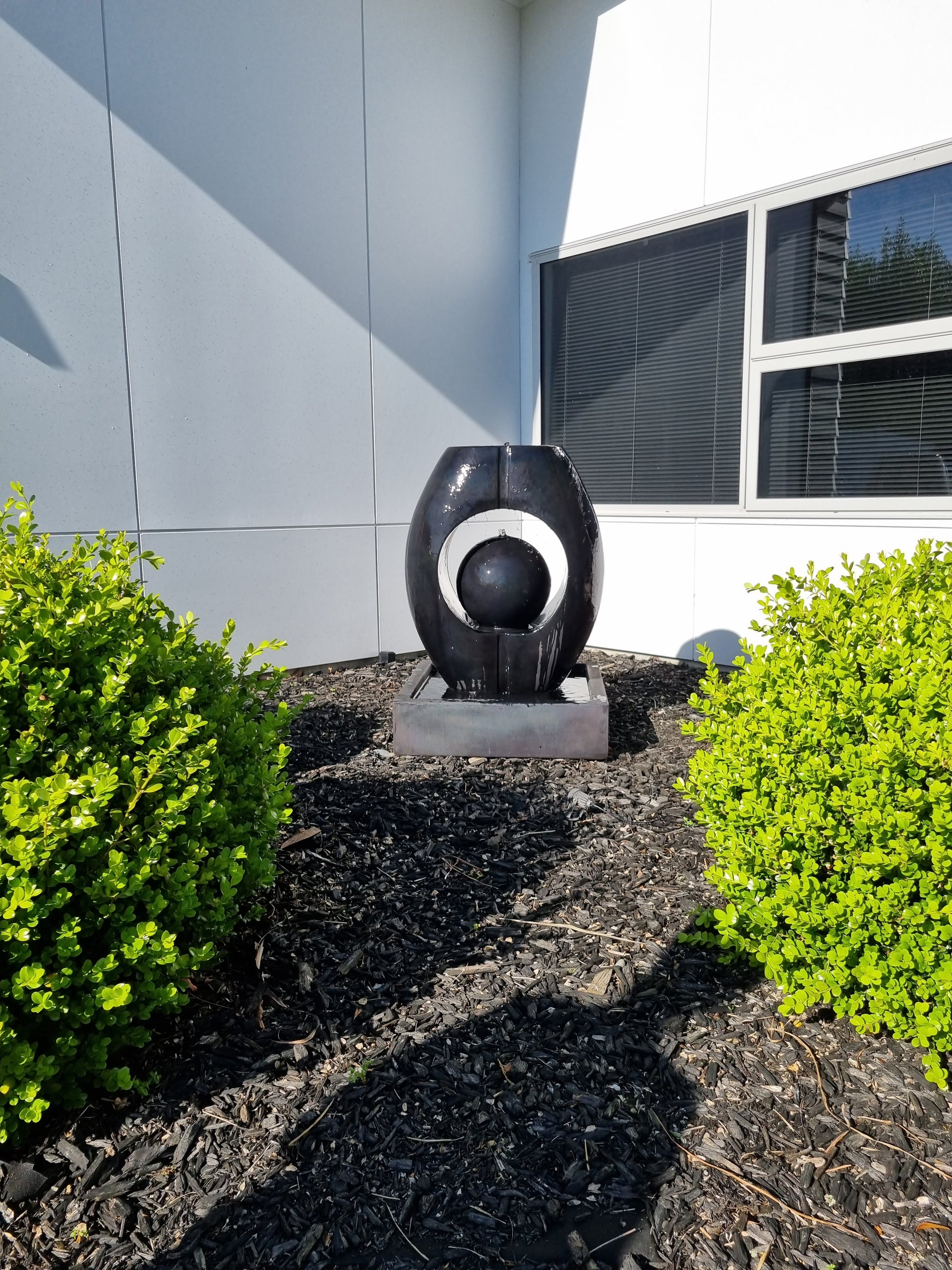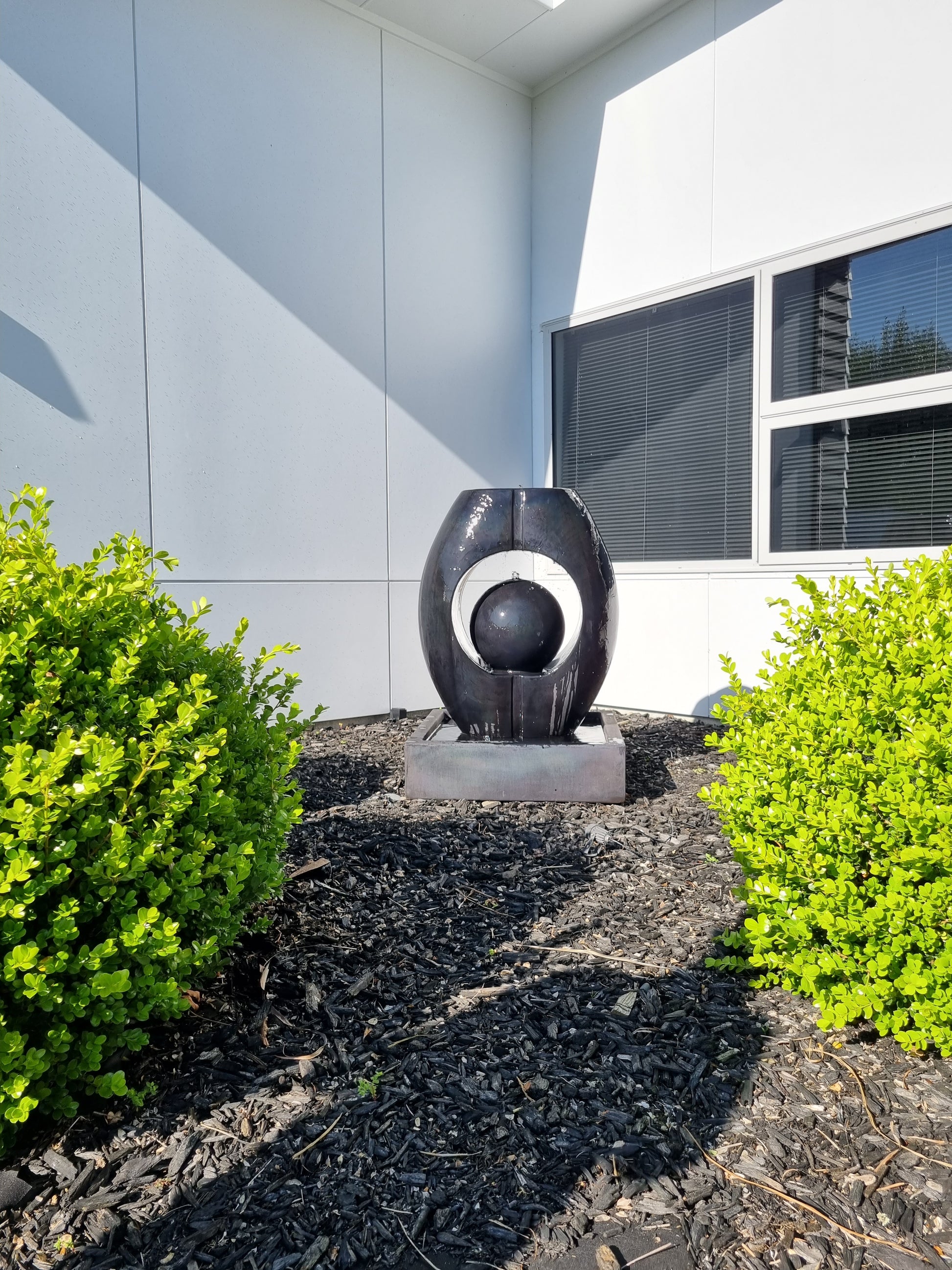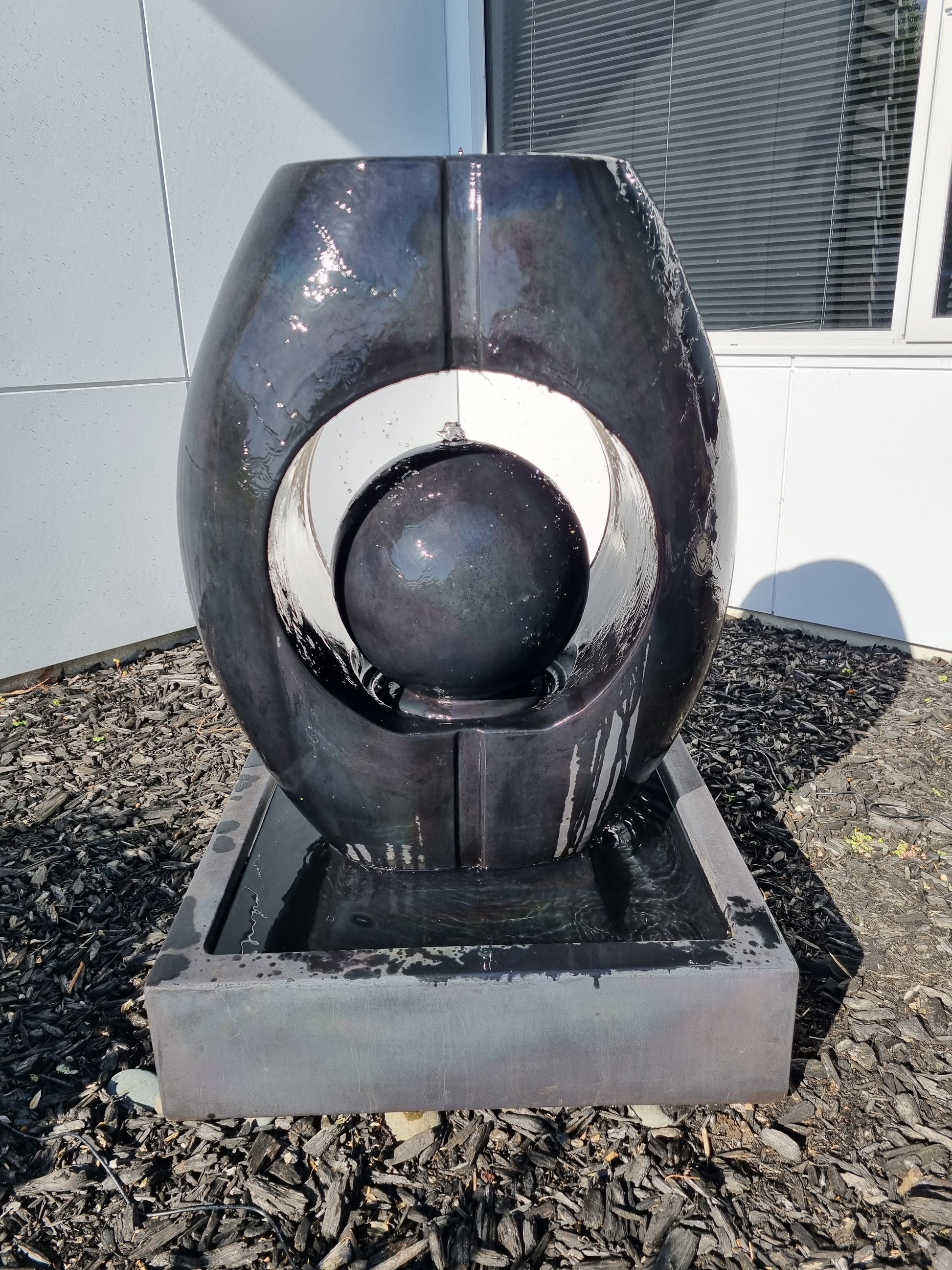 Bring a sense of elegance and calm to your outdoor space with this striking contemporary water feature. A solid square trough forms the base, with a sleek pedestal rising to support an impressive oval centerpiece. The oval has a hollow circular cut-out, cradling a smooth ball within its centre. Water gently flows from the top of the oval and cascades from the ball, creating a soothing interplay of movement and sound. Stylish and sculptural, this feature makes a bold statement while adding a tranquil atmosphere to your garden, patio, or entryway.