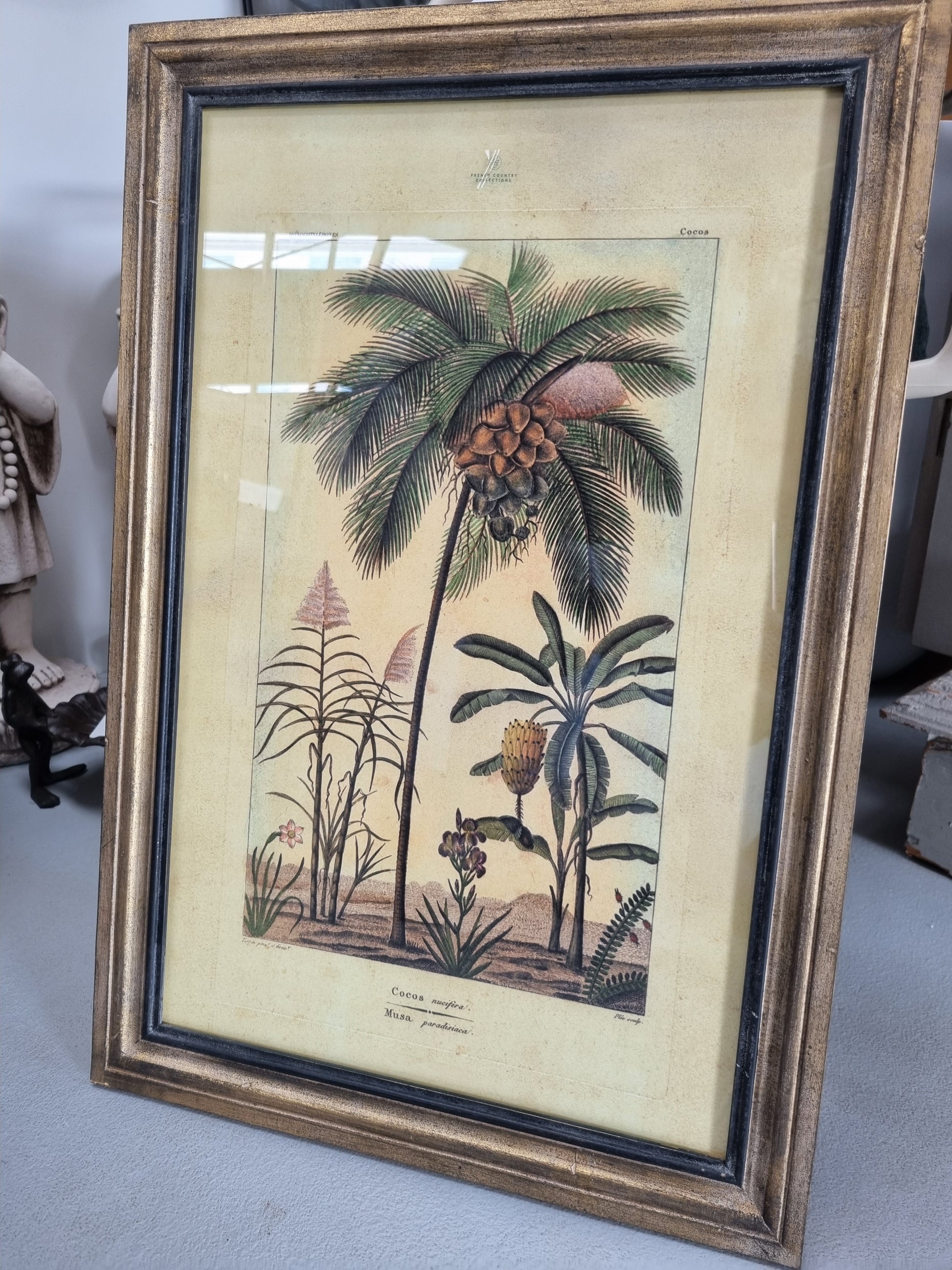 Beautiful vintage botanical illustration of palm tree species set in an antique gold and black wooden frame.