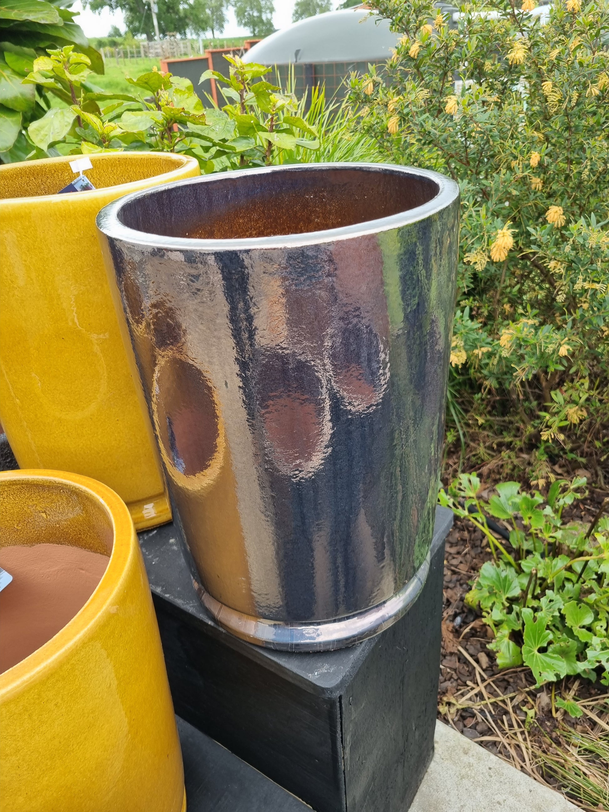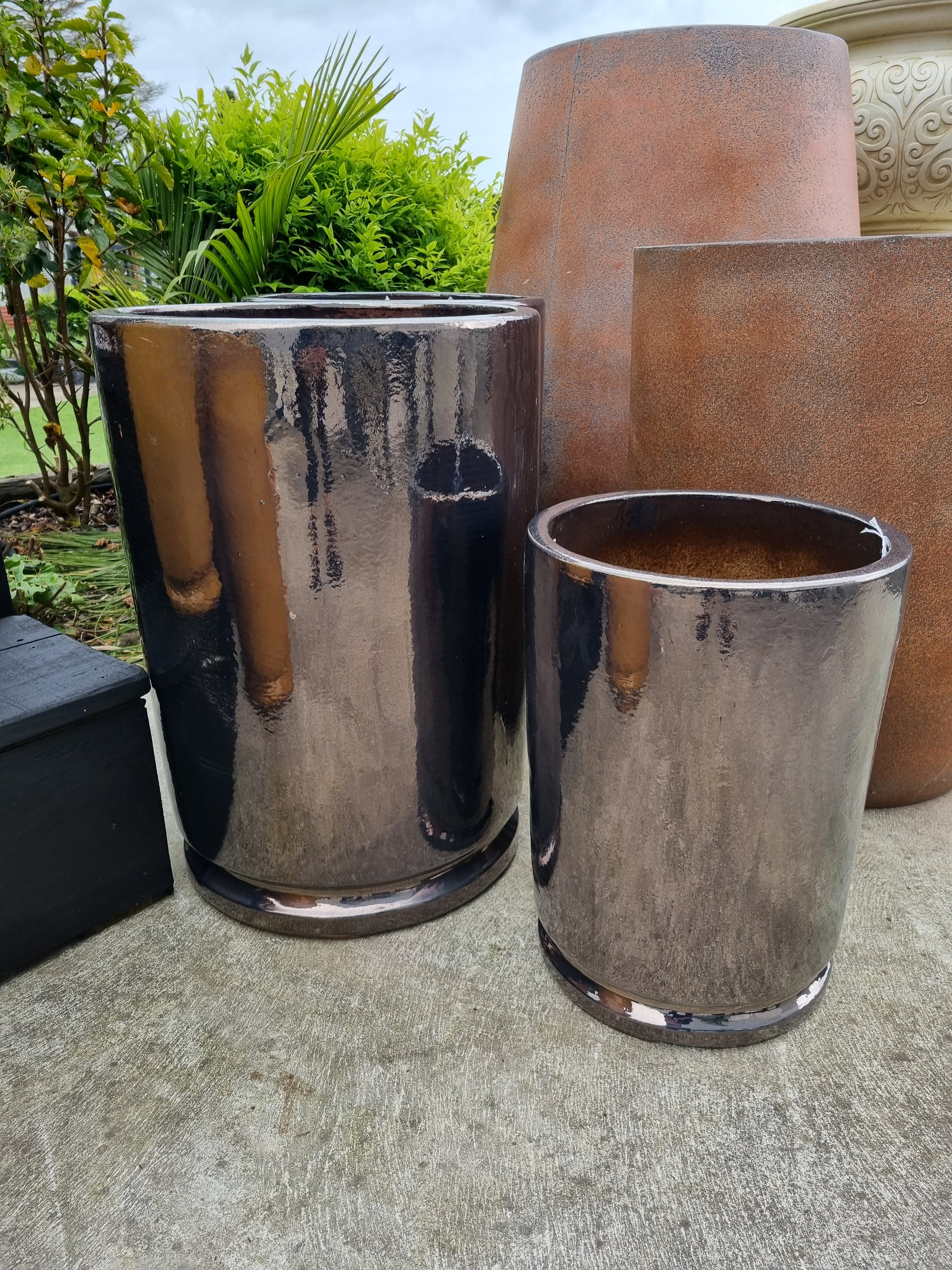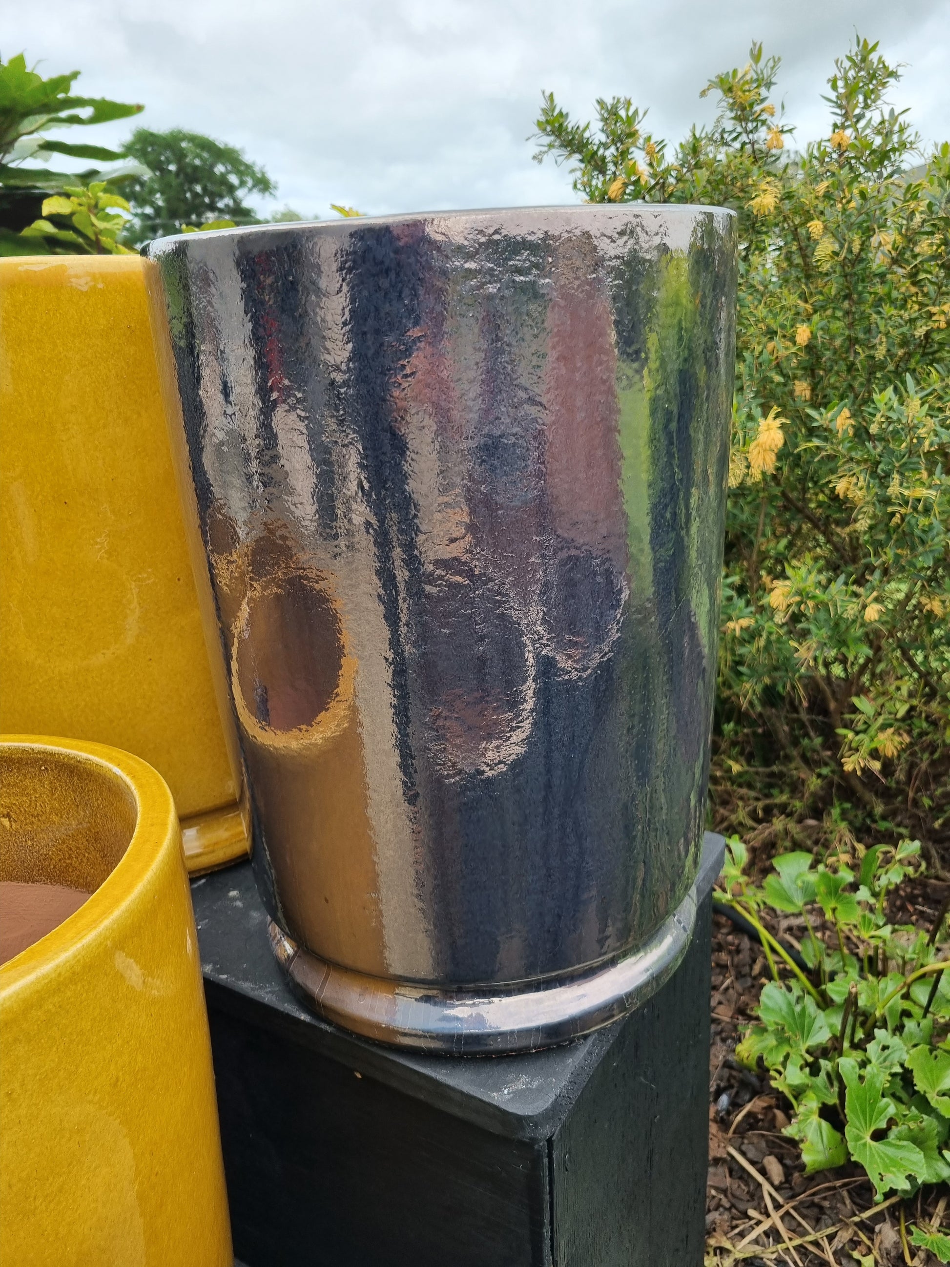 Bring a pop of personality to your garden or home with these stunning terracotta cylinder pots, finished in a rich silver/black mirror glaze. Their tall, elegant shape is complemented by a subtle rim at the base, giving the illusion of a petite built-in pedestal — a clever touch of design flair. The result? A perfect blend of modern sophistication and earthy charm.