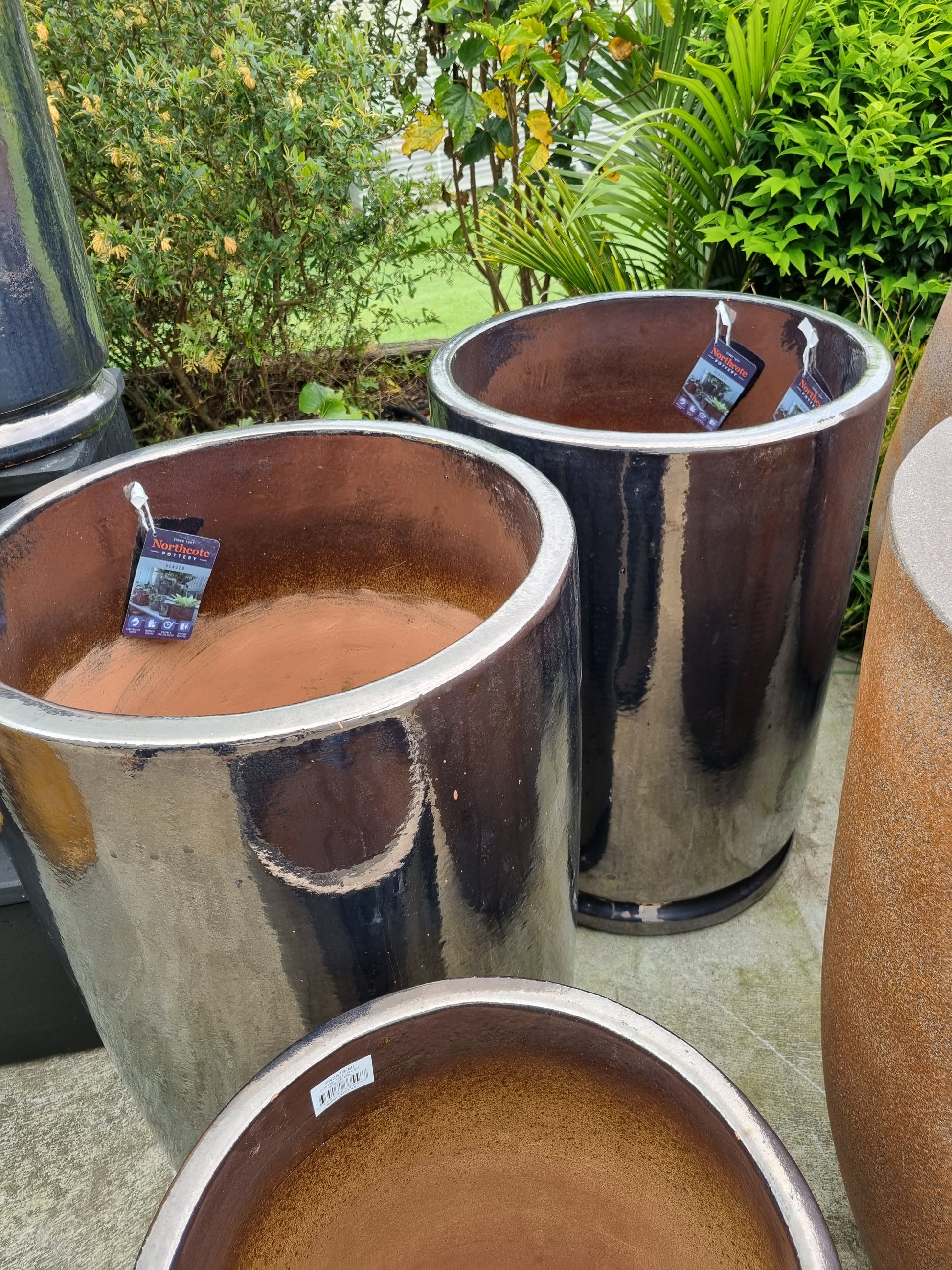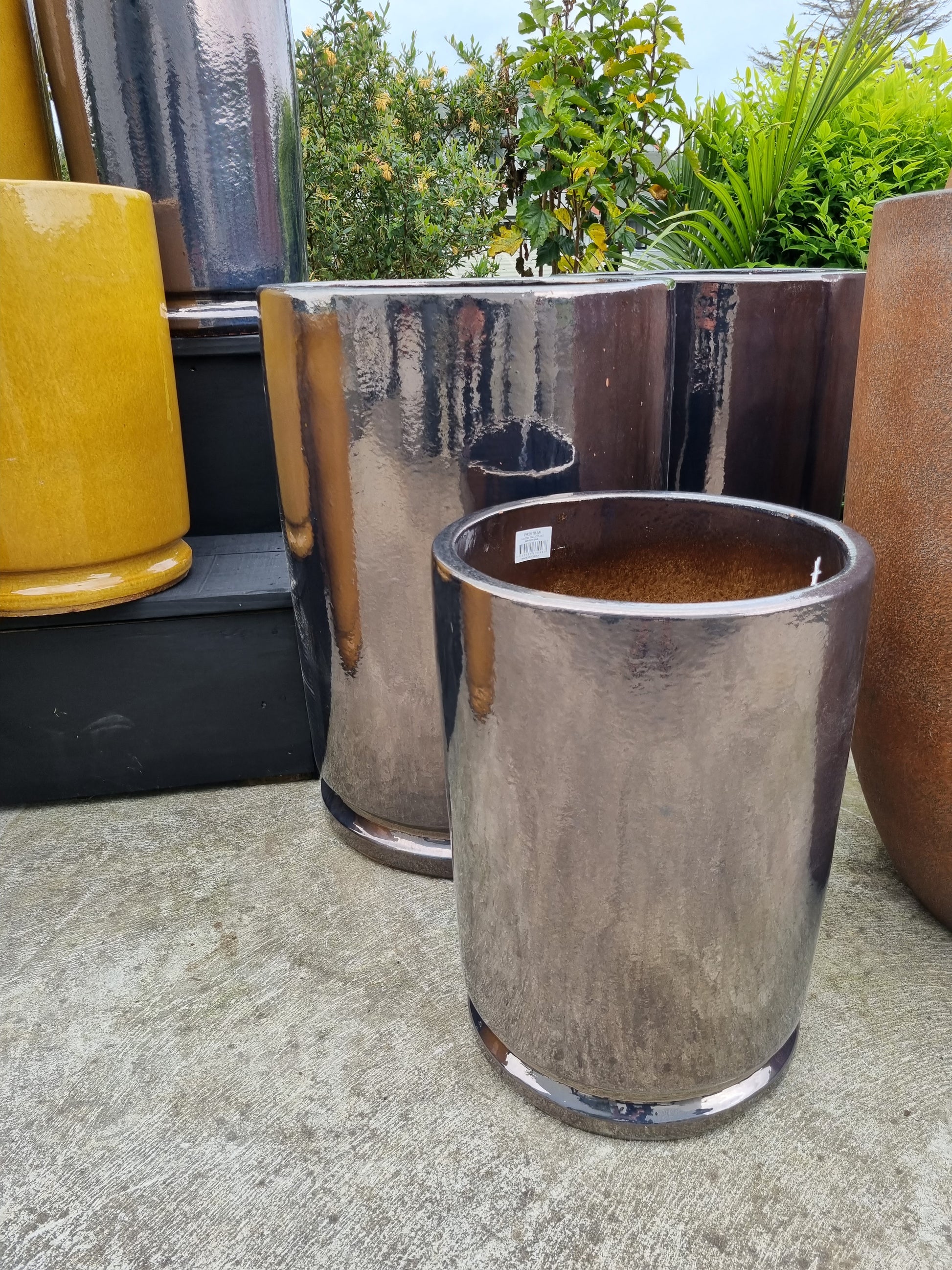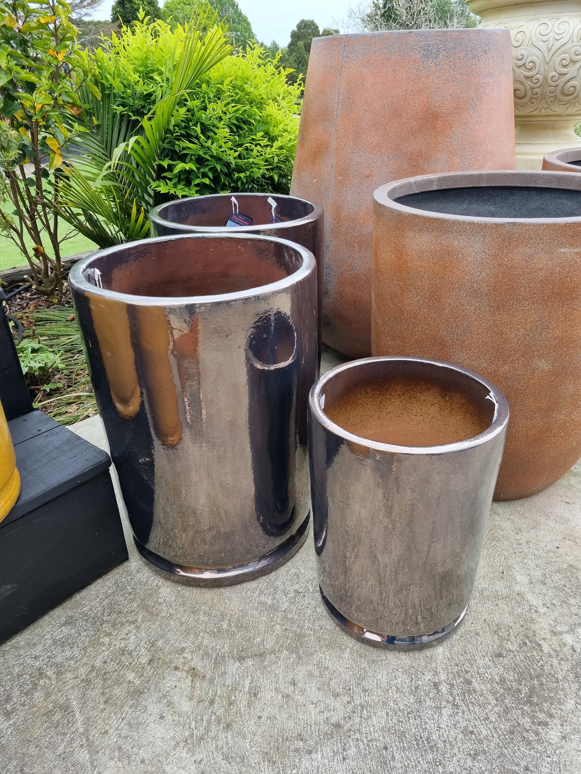 Bring a pop of personality to your garden or home with these stunning terracotta cylinder pots, finished in a rich silver/black mirror glaze. Their tall, elegant shape is complemented by a subtle rim at the base, giving the illusion of a petite built-in pedestal — a clever touch of design flair. The result? A perfect blend of modern sophistication and earthy charm.