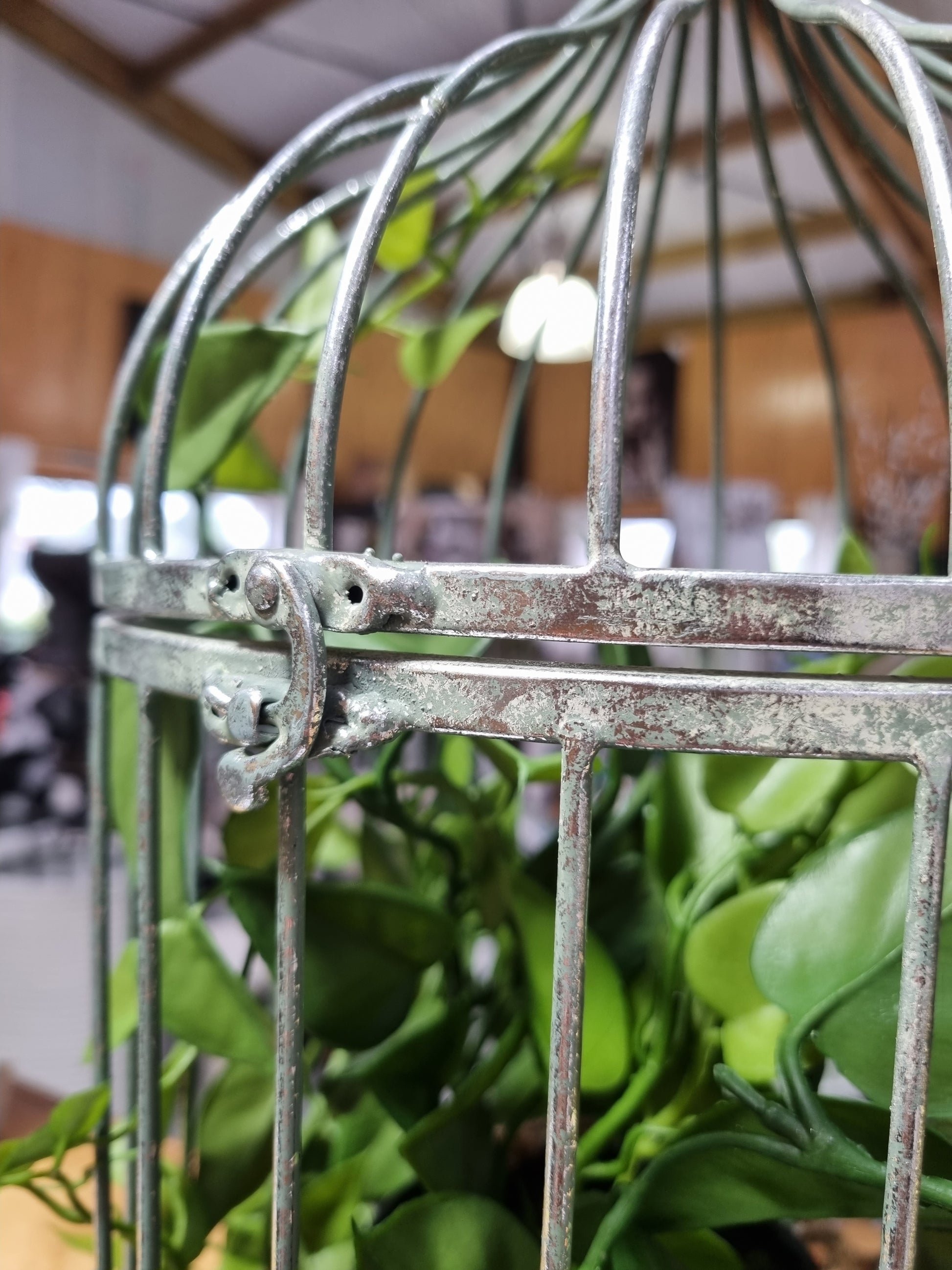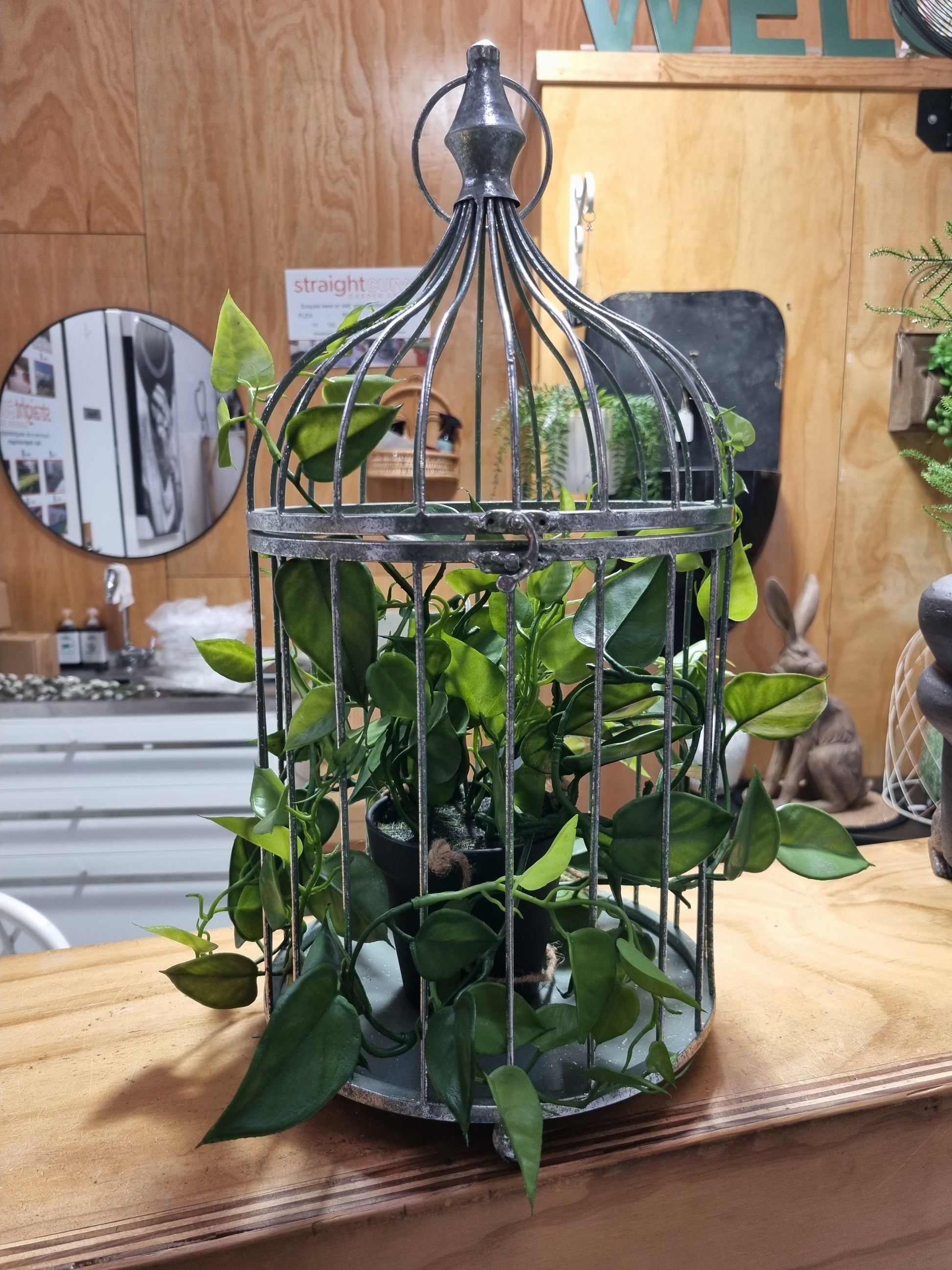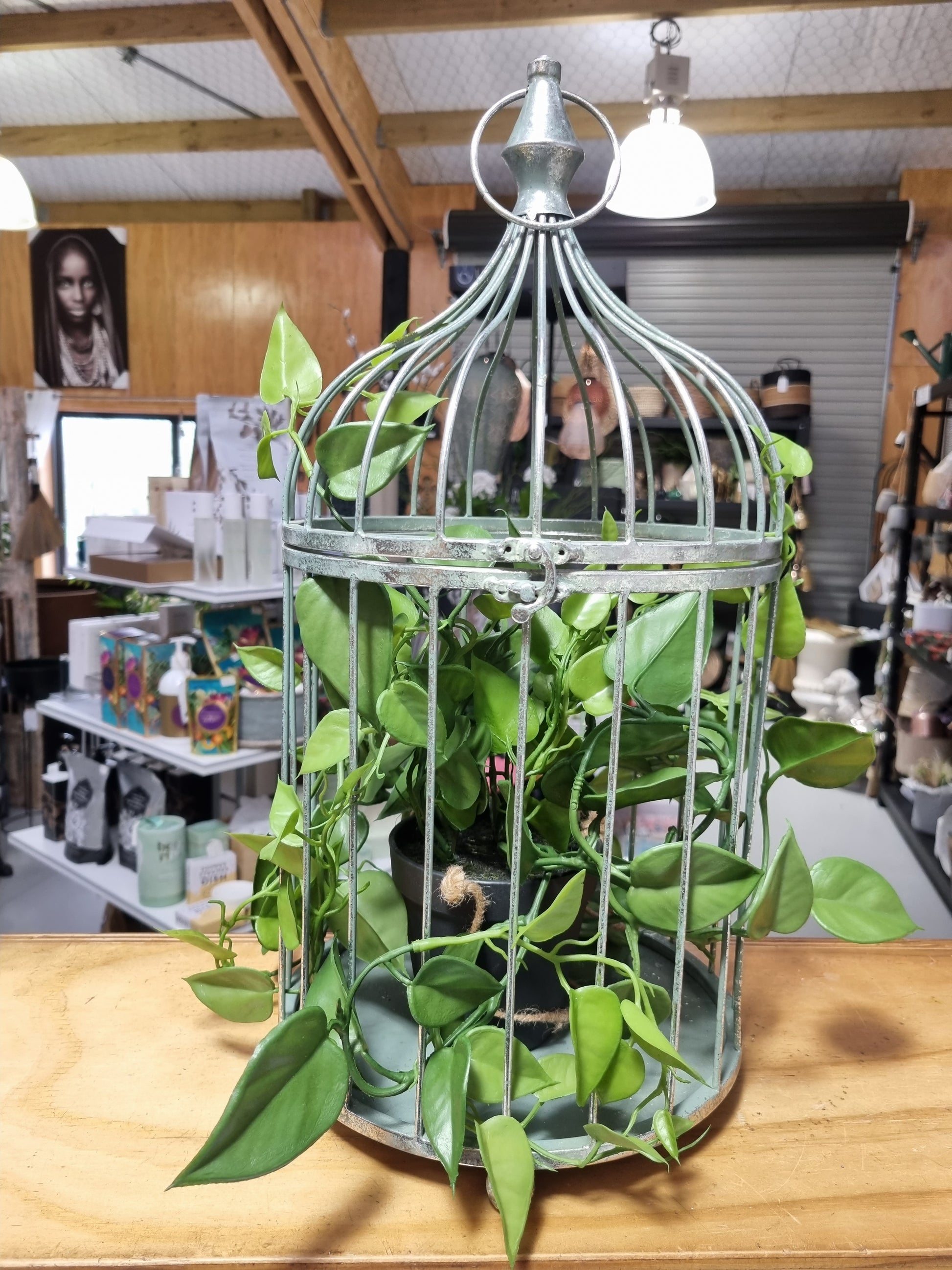 Bring a touch of vintage charm to your home with this silvery-green hanging birdcage planter. Beautifully detailed with a soft aged finish, it’s designed with three little round ball feet so you can perch it on a shelf or table, or hang it proudly from its elegant spear-topped hook. The top opens for easy access, making it simple to swap out plants whenever the mood takes you. Perfect for trailing greenery or delicate blooms, this piece is as versatile as it is striking