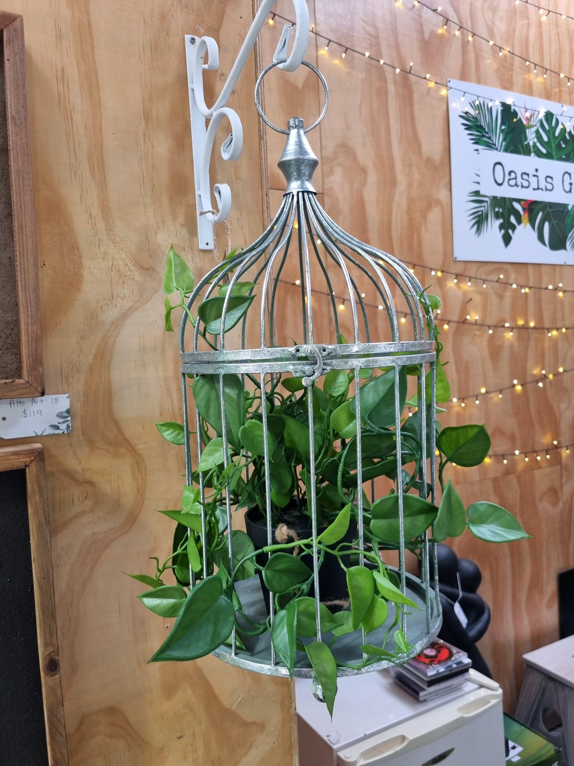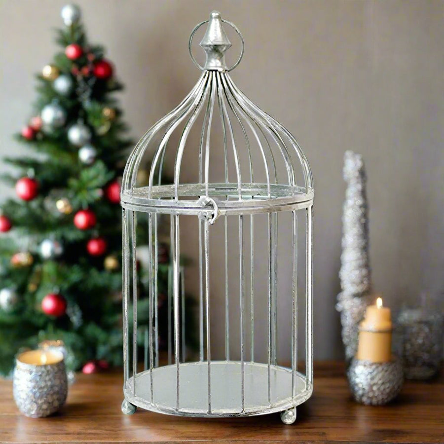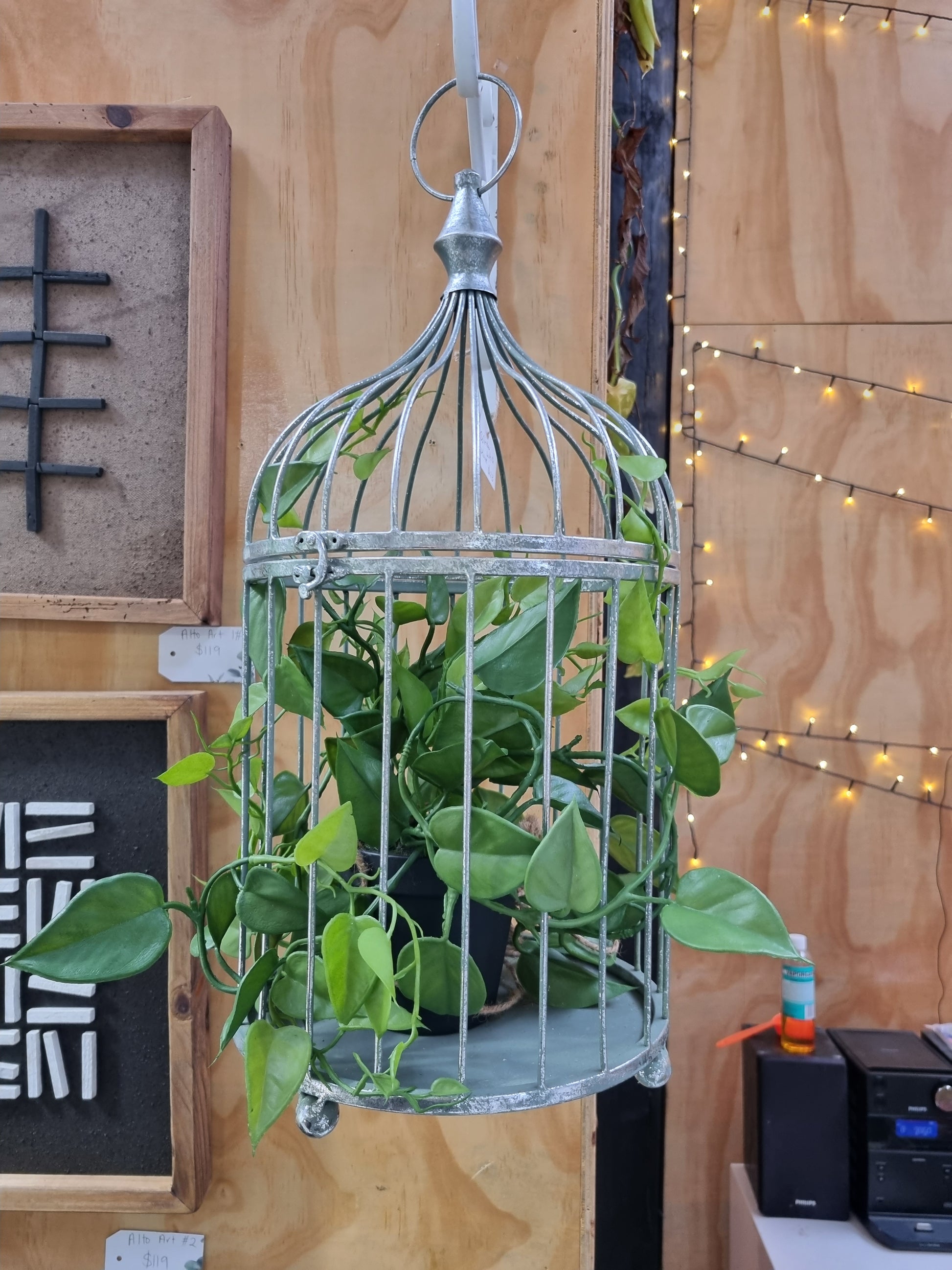 Bring a touch of vintage charm to your home with this silvery-green hanging birdcage planter. Beautifully detailed with a soft aged finish, it’s designed with three little round ball feet so you can perch it on a shelf or table, or hang it proudly from its elegant spear-topped hook. The top opens for easy access, making it simple to swap out plants whenever the mood takes you. Perfect for trailing greenery or delicate blooms, this piece is as versatile as it is striking